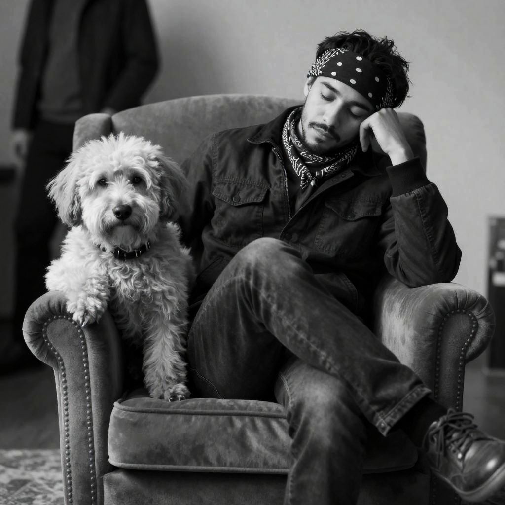 Black and white photograph of a man with a dog. The man lies on the ground, wearing a hat and jacket, while the dog stands over him, looking down. The man has a neutral expression, and his hands are raised. The background includes a bed with rumpled sheets and a chair. The dog wears a harness. The man and dog are positioned centrally, interacting closely.