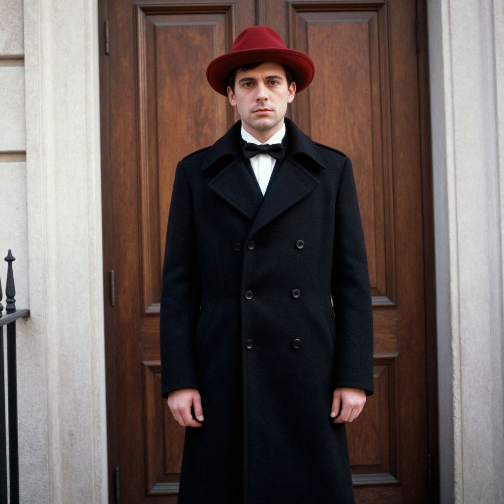 Film Star Fancy Costume, man in a black coat and red hat standing in front of a door