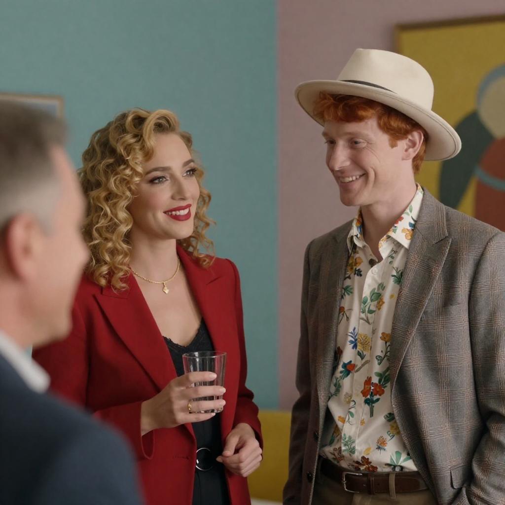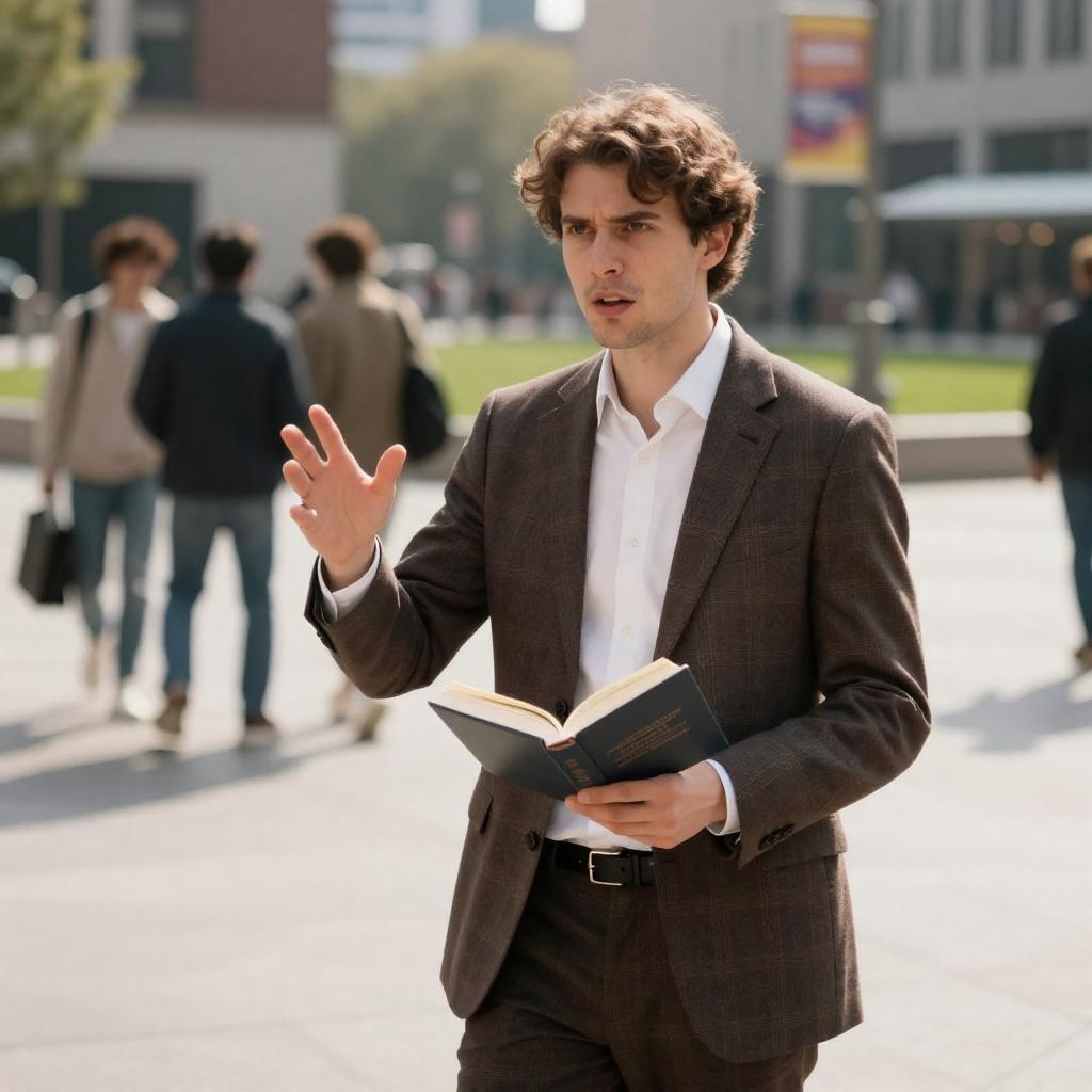 Excited Man with Bun in Plaid Suit