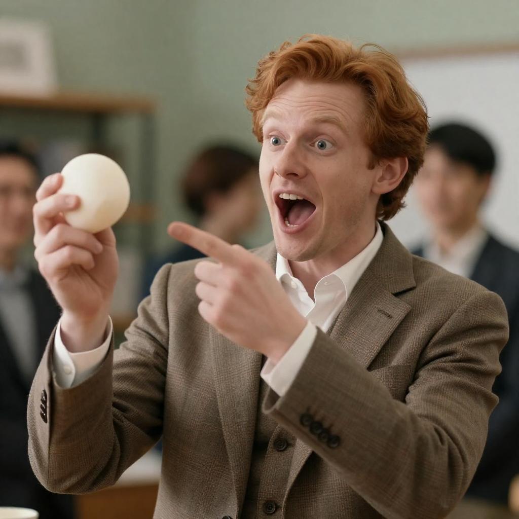 A man with reddish-brown hair, wearing a brown plaid suit, points excitedly at a white bun in his hand. His mouth is open in a wide, intense expression. Background includes blurred people and a green wall with shelves.