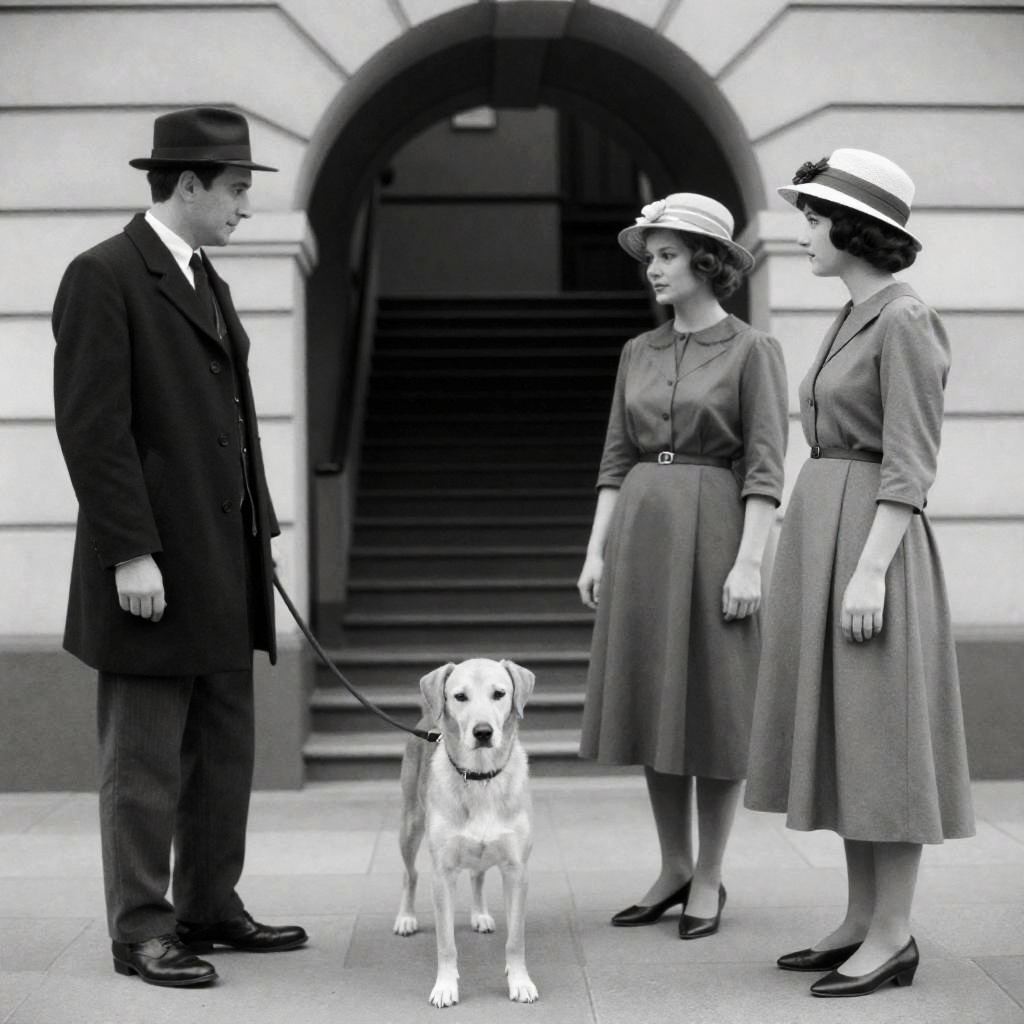 Black-and-white photograph of a man in a bowler hat and dark jacket sitting on a ledge, smiling, with a dog lying at his feet. The man leans forward, hands resting on his knees. Background includes a blurred window.