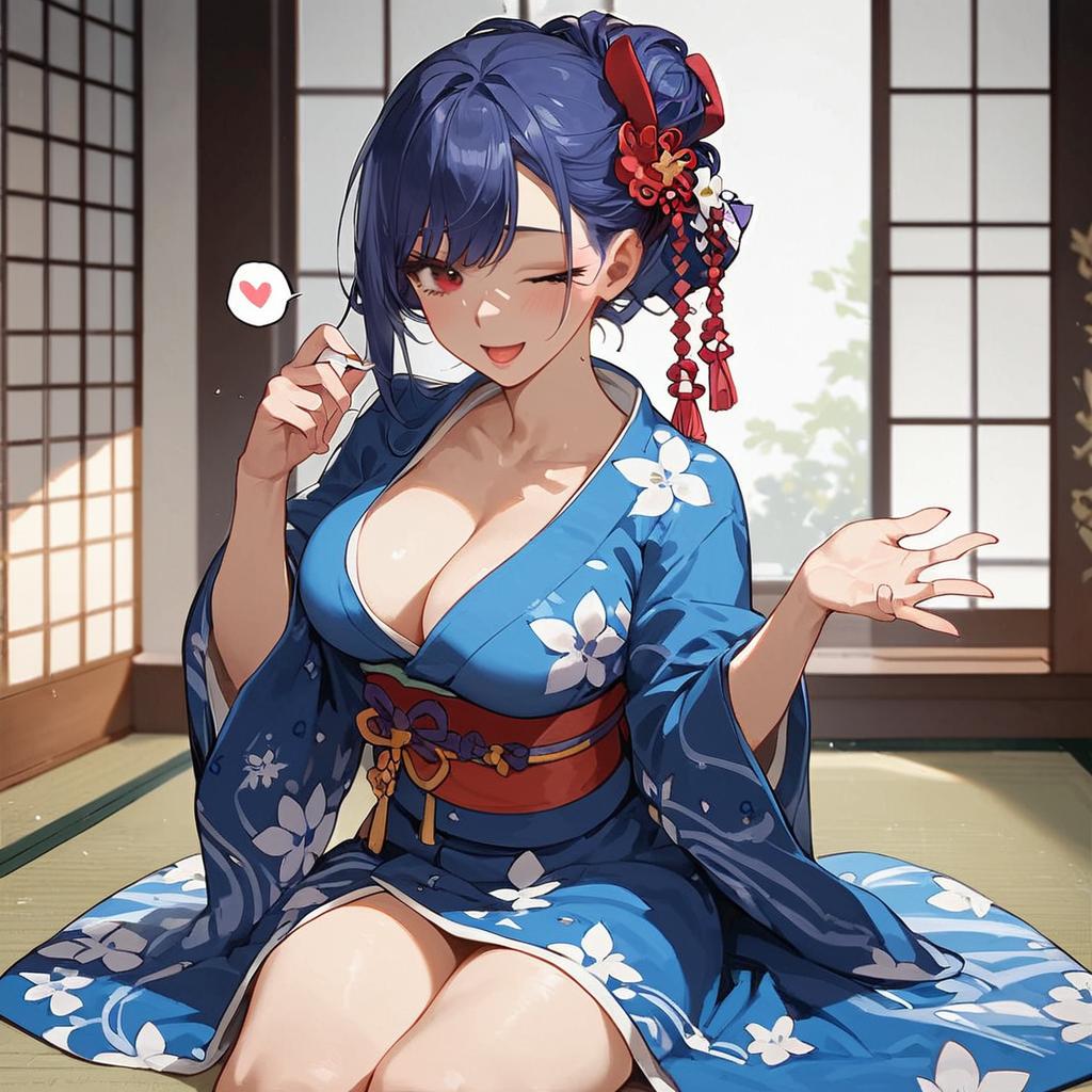 Score_8_up, score_7_up, source_anime, best quality, masterpiece, anime screencap, source_anime, (ai-generated:0.3), ykts, solo, large breasts, seductive smile, open mouth, blowing kiss, hair bun, ribbon, hair ribbon, japanese clothes, kimono, yukata, wide sleeves, obi, floral print, spoken heart, one eye closed, w-sitting, wariza, in ryokan, looking at viewer