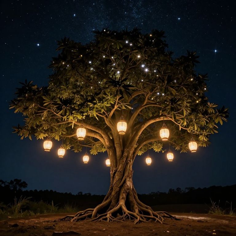 A celestial beacon of serenity, the tree stands rooted in earth yet illuminated by starlight, its branches cradling hanging lanterns that cast a warm glow, symbolizing hope and the enduring connection between the mortal world and the infinite cosmos.