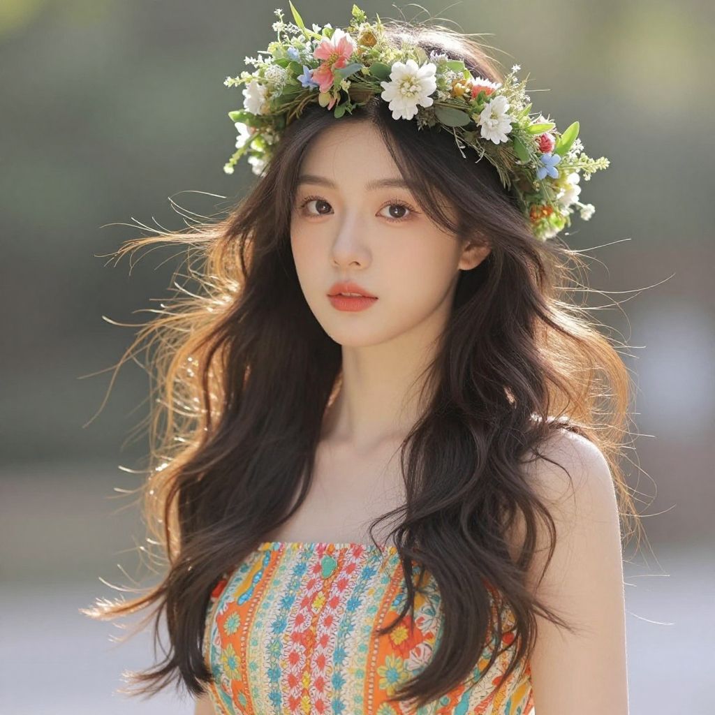 A young woman with long, flowing hair wears a floral crown, exuding a natural and enchanting charm. Her vibrant dress complements the serene atmosphere, hinting at a lifestyle that embraces beauty and elegance in everyday moments.