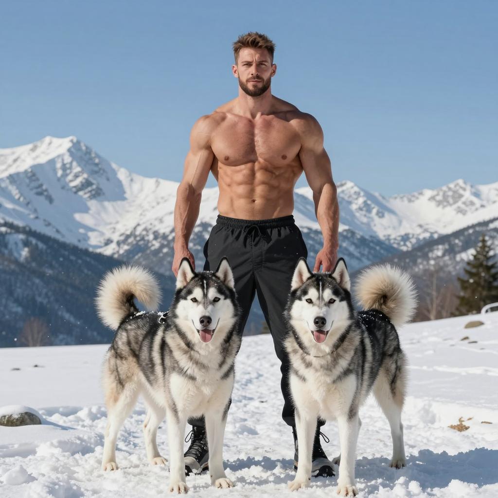 A muscular man standing on snow with two husky dogs in front of him, snowy mountain landscape in the background, clear blue sky, falling snowflakes, bright natural lighting highlighting skin tones and fur texture, high detail, realistic photographic style
