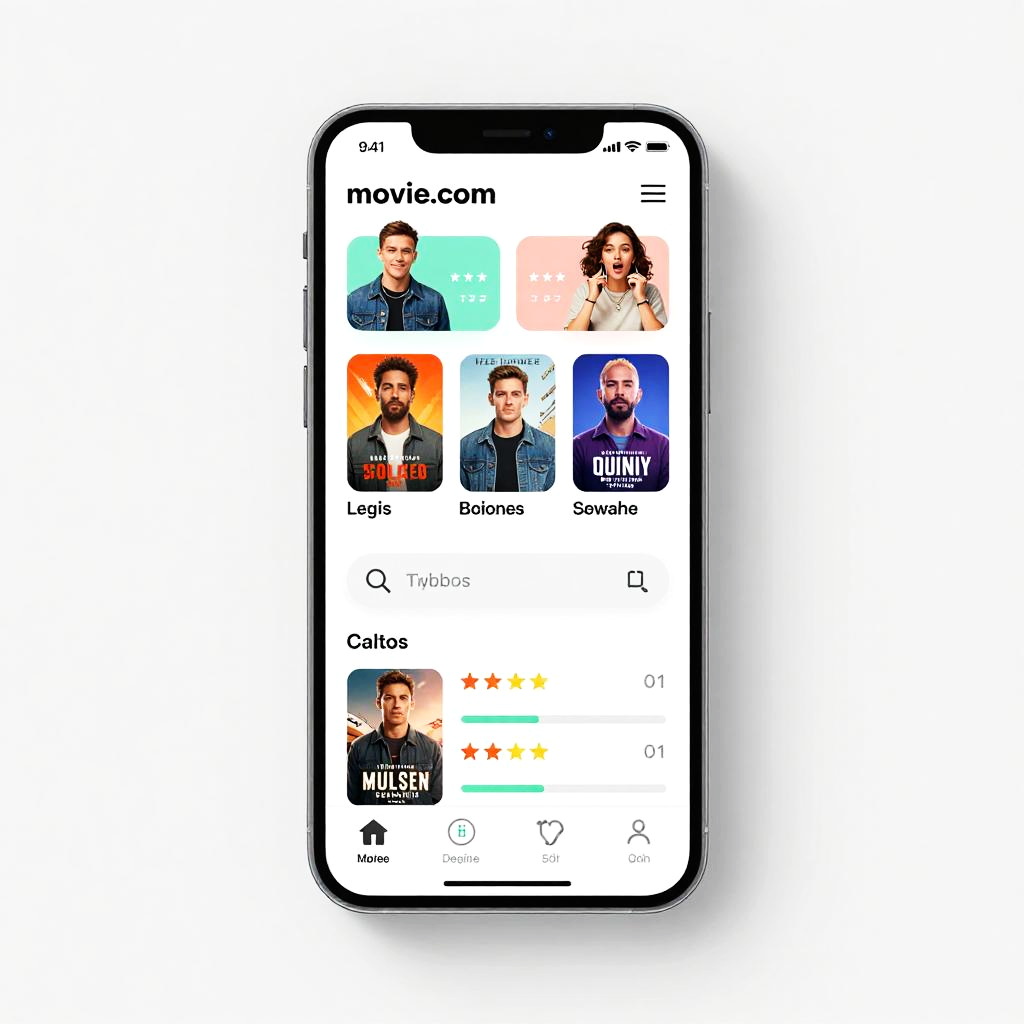 Movie.com UI/UX design showcasing a responsive movie discovery app interface on a smartphone with vibrant thumbnails, star ratings, and dynamic search bars, presented in a clean minimalistic style with pastel color palette and smooth animations.