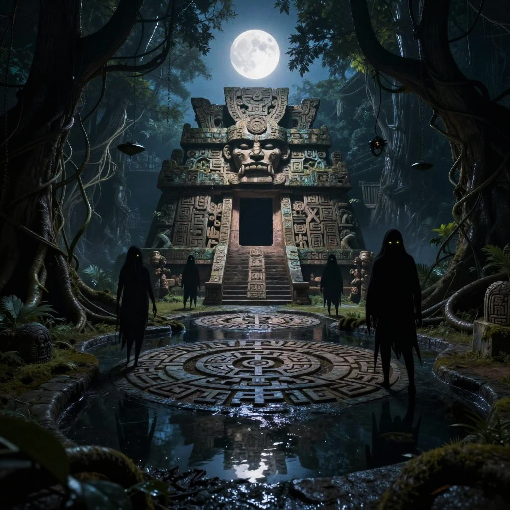 A mystical interpretation of Xibalba, presenting a haunting landscape of twisted vines and dark water pools reflecting ancient Mayan symbols, shadowy figures with glowing eyes roaming the terrain, bathed in cold moonlight and deep shadows.