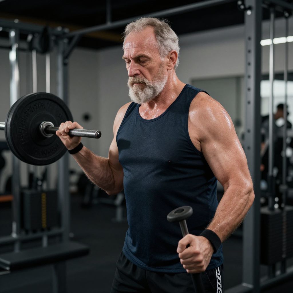 Photograph of an elderly, muscular man with gray hair and beard, wearing a black tank top, lifting a barbell in a dimly lit gym