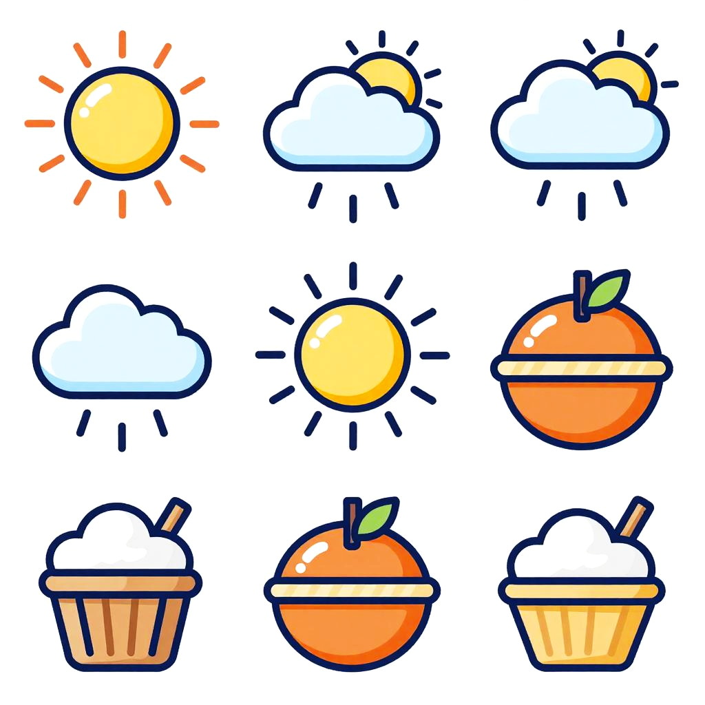 Clip art AI generator showcasing an array of thematic clip art sets, including holidays, weather, and food icons, rendered with clean, bold outlines and lively colors against transparent backgrounds, ideal for quick customization and use.