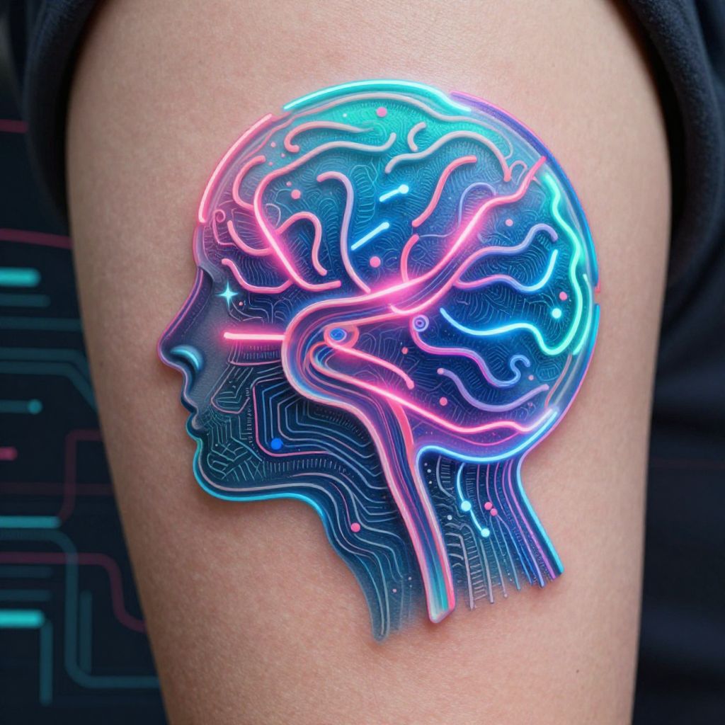 AI tattoo generator visualization, abstract neural network design morphing into tattoo patterns on skin, vibrant color gradients with electric blue, pink, and teal hues, sci-fi atmosphere with data lines and circuit motifs in the background, digital art blending technology and human expression