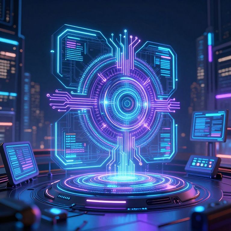 Neon-lit digital hologram of a glowing, circular interface with blue and purple lines, surrounded by futuristic cityscape and floating screens. Cyberpunk