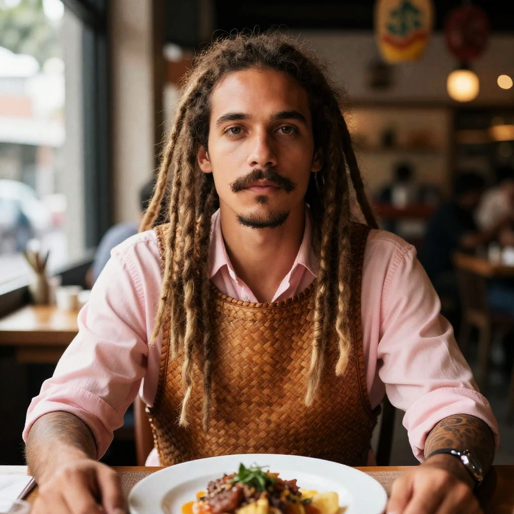 Portrait of a man with long blonde dreadlocks, a mustache, and a tattoo on his left forearm. He is wearing a pink shirt with the sleeves rolled up and a woven brown basket-style chest cover. Seated at a restaurant table with a plate of food in front of him. The background shows a window, hanging decorations, and blurred restaurant interior.