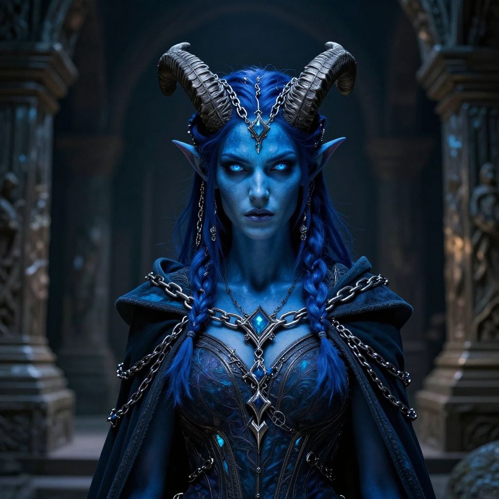 Portrait of blue female tiefling with luminous cobalt skin, fierce expression, braided horns entwined with silver chains, wearing a mystical cloak, standing in a shadowy ancient temple, high detail