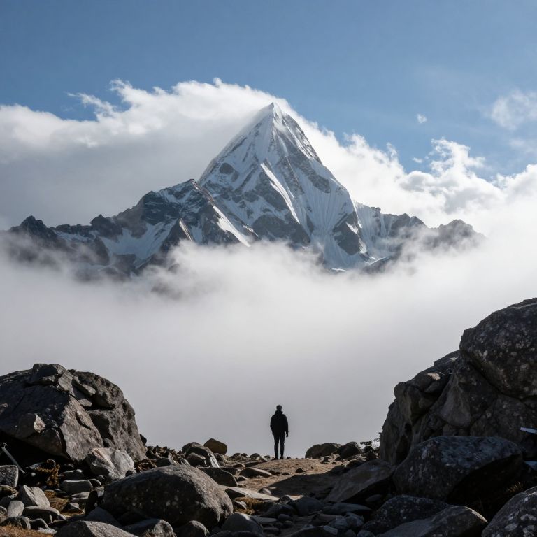 Mountain peak, sharp as a needle and towering majestically, pierces through layers of clouds and sunlight, casting its shadow over a solitary figure standing below amidst rugged terrain and scattered boulders.