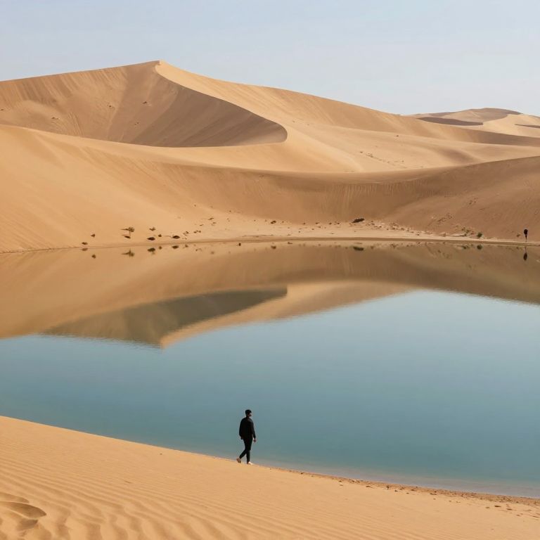 Photograph of a vast desert landscape featuring undulating sand dunes in warm beige tones. A calm, reflective waterhole occupies the mid-ground, mirroring the dunes. A solitary figure, dressed in dark clothing, stands near the water's edge, casting a small shadow. The sky is clear with a gradient from pale blue to white at the horizon. The sand displays gentle ripples, and sparse vegetation dots the dunes. The overall composition highlights the contrast between the smooth water surface and the textured sand.