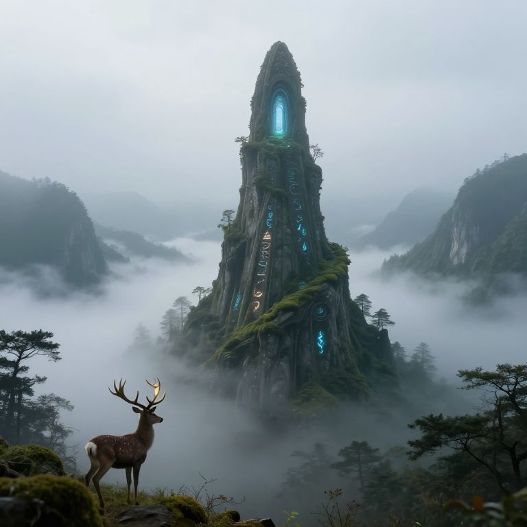 Fantasy spire ai: A misty fantasy spire ai emerges at the edge of a forgotten valley, cloaked in fog and enchanted moss. The structure has a spiral design with glowing glyphs that shift subtly with the wind. A small portal opens on the top, revealing a shimmering portal to another realm. A deer with golden antlers watches from the forest edge.