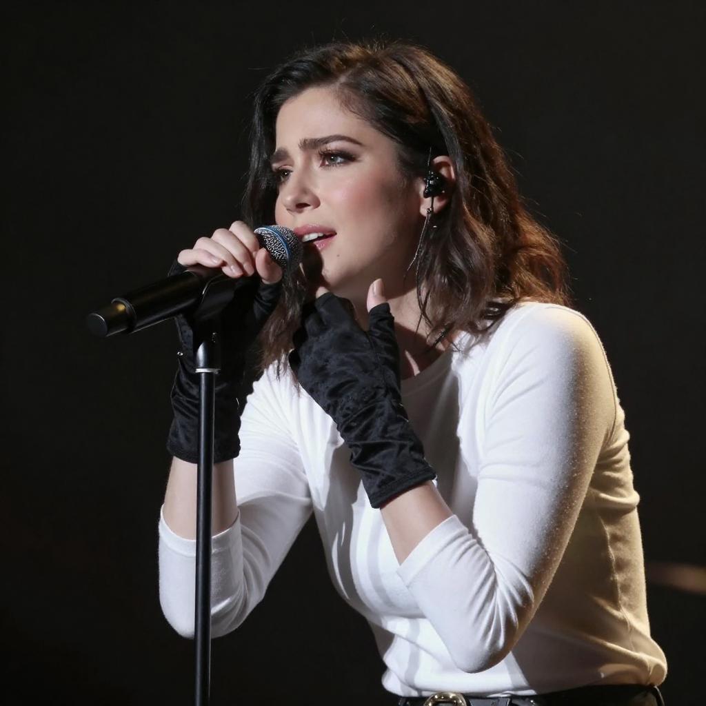 Photograph of a female singer with long brown hair in a ponytail, wearing a black leather jacket and black pants, passionately singing into a microphone while leaning forward. A guitarist with a bass guitar is partially visible in the background, illuminated by red and blue stage lights.
