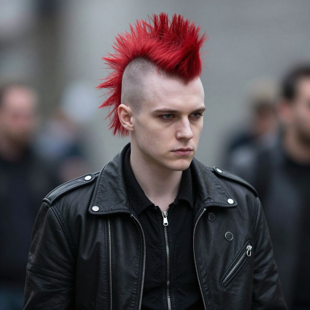 Photograph of a pale-skinned, punk-styled young man with bright red, spiked mohawk, shaved sides, black leather jacket, and serious