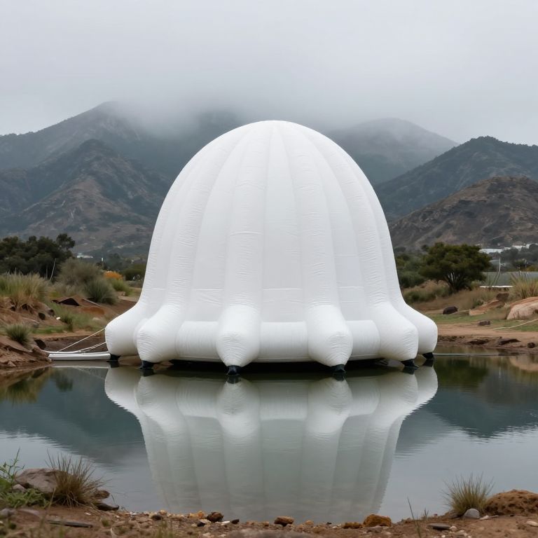 Photograph of a white, dome-shaped, inflatable structure covering a mountain-like object, reflecting in a calm lake, surrounded by rocky terrain and mist-covered