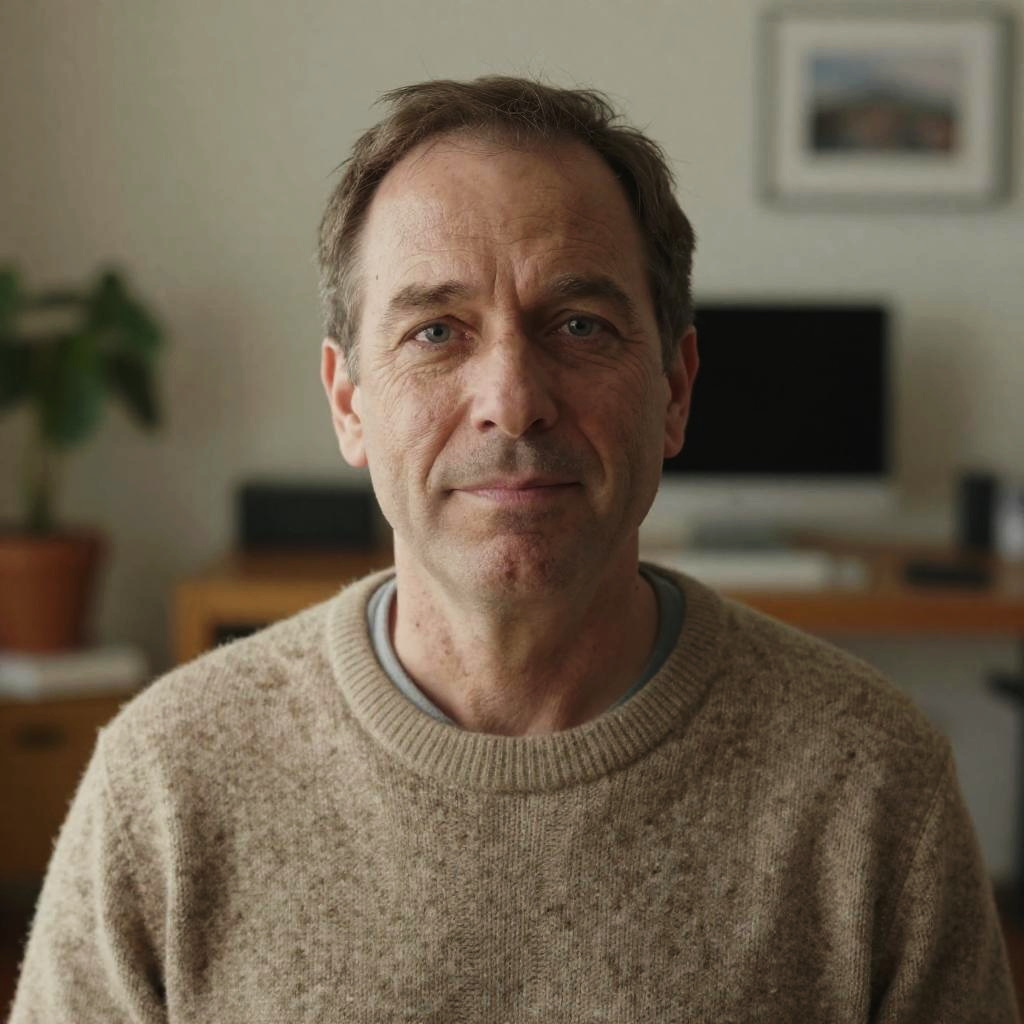 Realistic Steve portrayed as a kind and approachable character, detailed skin pores and wrinkles, realistic hair strands, dressed in a cozy sweater, surrounded by a softly blurred background of a home office, warm natural light enhancing the mood.