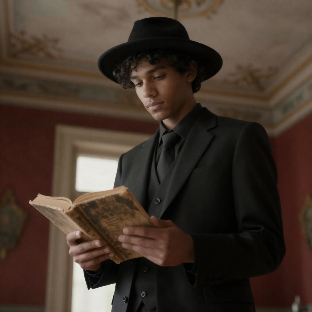 Photograph of a young man with medium brown skin and dark hair, wearing a black hat and suit, holding a dusty, worn book. He stands in an ornate room with a faded, painted ceiling and red patterned walls. Natural light filters through a doorway behind him.