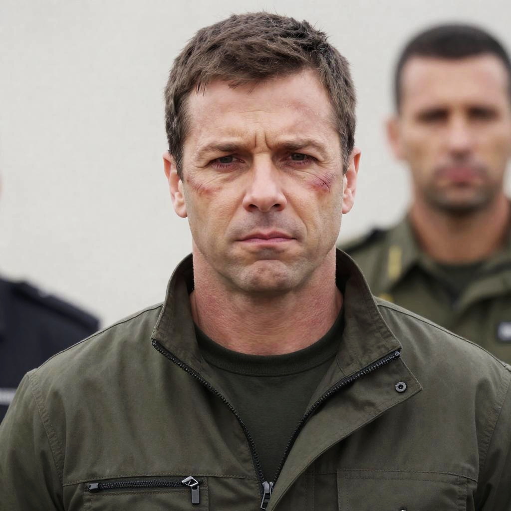 Photograph of a middle-aged man with short brown hair, a slight frown, and a bruise on his right cheek. He wears a green jacket over a black shirt. Background has a blurred man with dark hair and brown uniform.