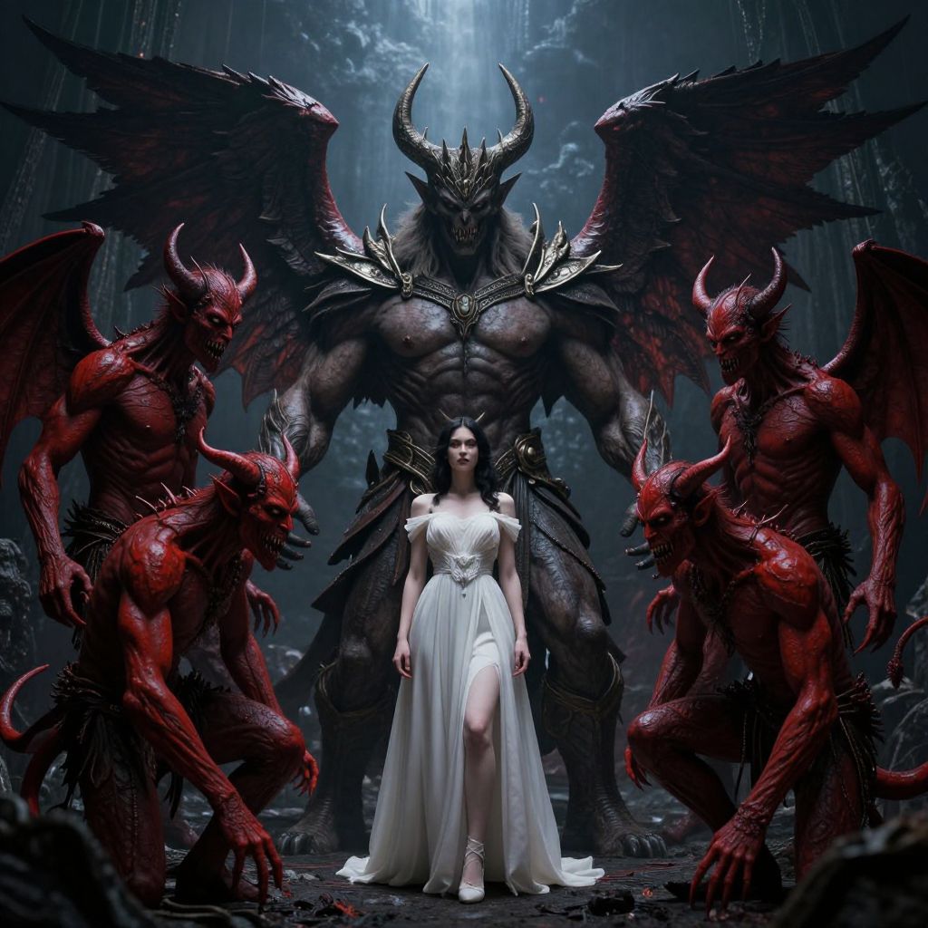 A dark, fantastical scene depicts a muscular figure with wings and a crown, surrounded by red demons and a woman in a white dress, all set against a dramatic, otherworldly background.