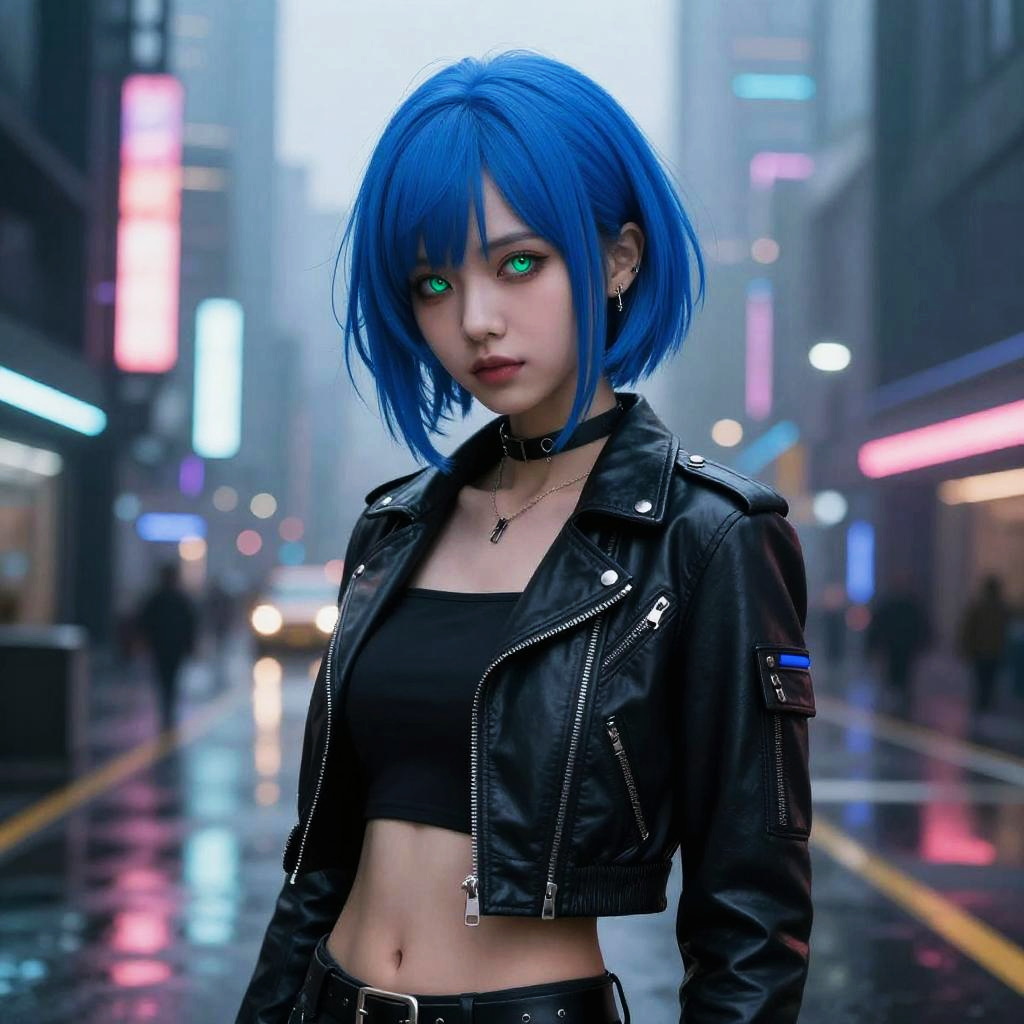 Digital artwork of an anime-style woman with bright blue bob haircut, green eyes, black leather jacket, and crop top, standing in a neon-lit