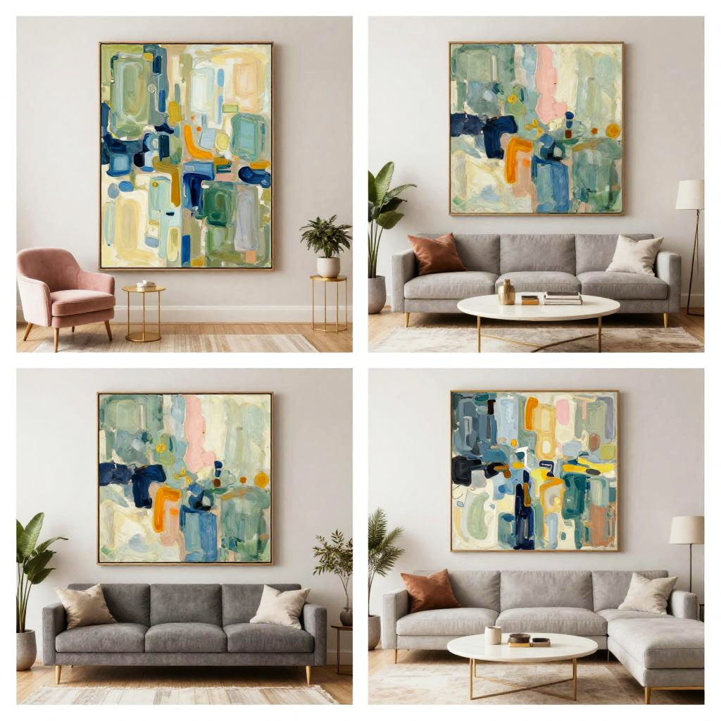 This collage features four photos of modern living rooms, each showcasing large, vibrant abstract paintings with a mix of greens, blues, pinks, and oranges. The top left room has a pink armchair and gold side table, while the top right features a gray couch with a coffee table. The bottom left shows a gray couch with a side table, and the bottom right has a light gray sectional with a coffee table. Each room has plants and soft lighting, creating a cozy, stylish atmosphere.