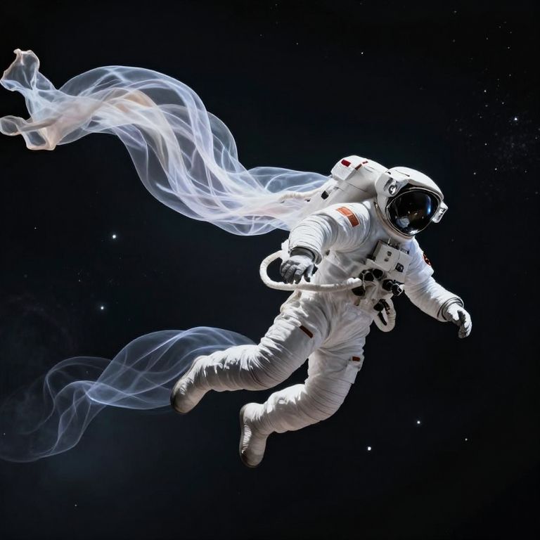 An astronaut drifts serenely in the void, tethered by ethereal, flowing fabric that billows like a celestial scarf, defying the boundaries between matter and light in a surreal cosmic dance.