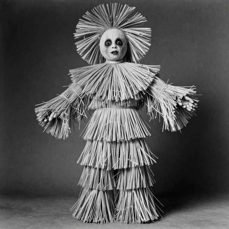 Ego Dissolution rag and straw doll by Goya, uncanny, freaky, full body portrait, vintage artistic black and white photograph,