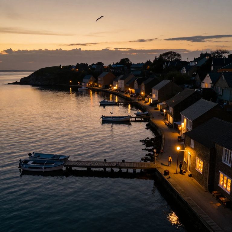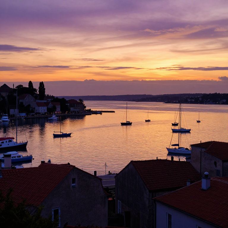 Photograph of a serene coastal sunset. The sky is painted in vibrant hues of orange, pink, and purple, reflecting on the calm water. Silhouetted against this colorful backdrop are small boats anchored in the harbor and quaint buildings with red-tiled roofs in the foreground. The distant shoreline is dotted with trees and more buildings, gradually fading into the horizon. The overall scene is peaceful and picturesque, capturing the tranquil beauty of the twilight by the sea.