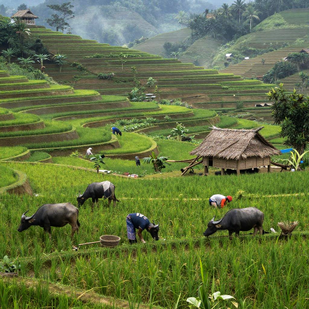 Desa rural scene with farmers working rice terraces, vibrant green paddies stretching across rolling hills, rustic huts, water buffalo grazing, misty morning atmosphere, intricate details in plants and traditional farming tools, peaceful and organic vibe