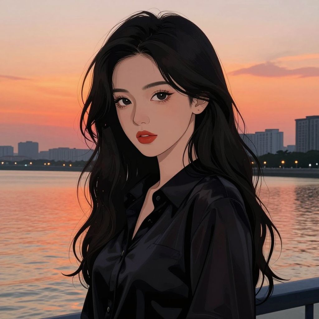 Digital anime-style portrait of a beautiful Asian woman with long black hair, red lipstick, wearing a black shirt, against a sunset-lit waterfront cityscape