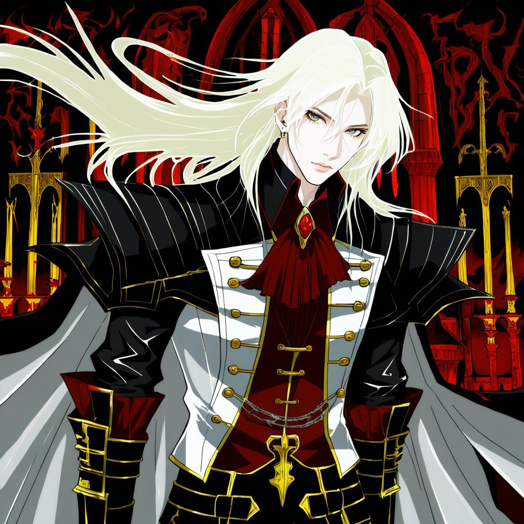 Digital anime-style artwork of Alucard from the Castlevania series. The character features long flowing white-blonde hair, striking yellow eyes, and is dressed in a detailed gothic military-style outfit with black, white, red, and gold accents. He wears a dramatic cape and is set against a dark, elaborate background resembling gothic architecture with red and gold tones, evoking a mysterious and supernatural atmosphere.