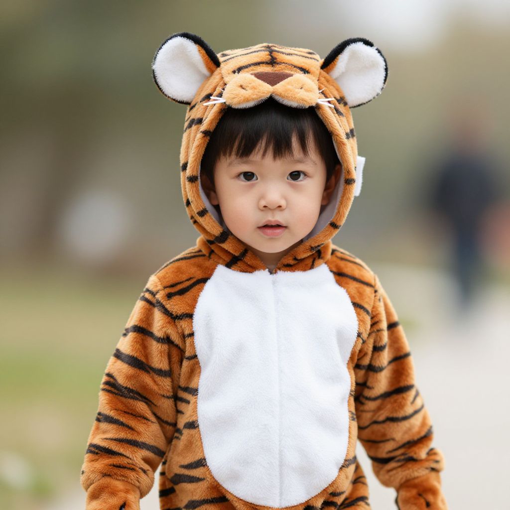 Tiger toddler costume, solo, tiger print, male focus, 1boy, animal print, animal costume, looking at viewer, blurry background, black hair, blurry