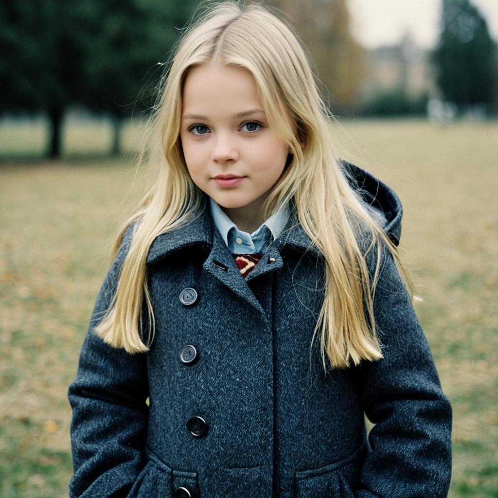 Portrait of a young blonde girl with long hair wearing a grey wool coat over a collared shirt and sweater, standing outdoors in a blurred natural setting. She looks directly at the camera with a calm expression during daytime.