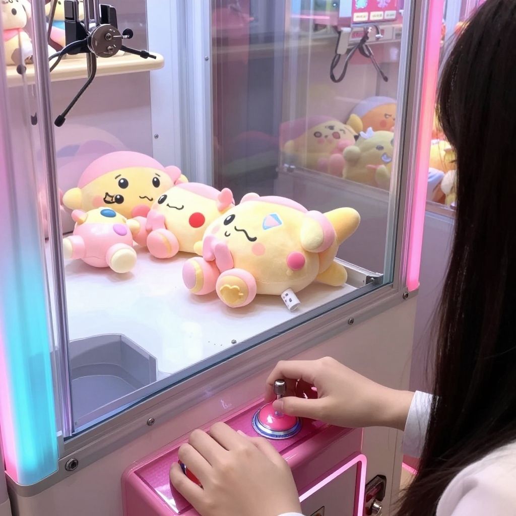 (((masterpiece))), (((best quality))), ((claw machine)), hands on bottom panel, control long joystick and press button, using clamp to pull the toy up, 1girl, komishouko, shy, blush, school uniform, claw machine, rear view
