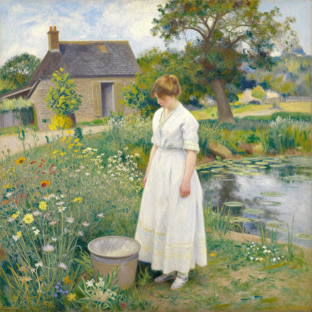 Woman in a serene pastoral landscape, Camille Pissaro's \"Washerwoman,\" depicts a figure in a flowing white dress standing near a pond surrounded by wildflowers, with a rustic house and lush greenery in the background, capturing the tranquil beauty of Eragny-sur-Epte, France.