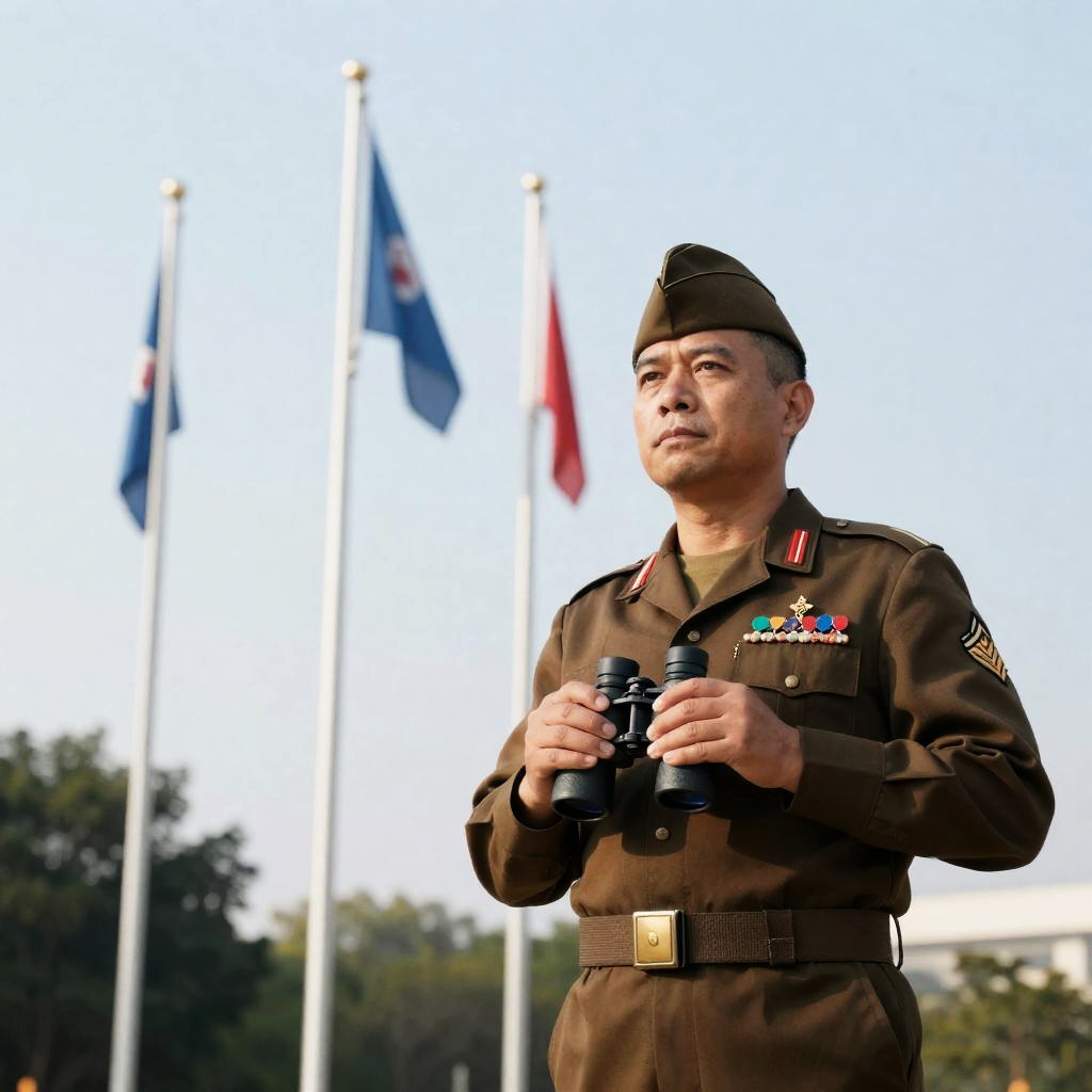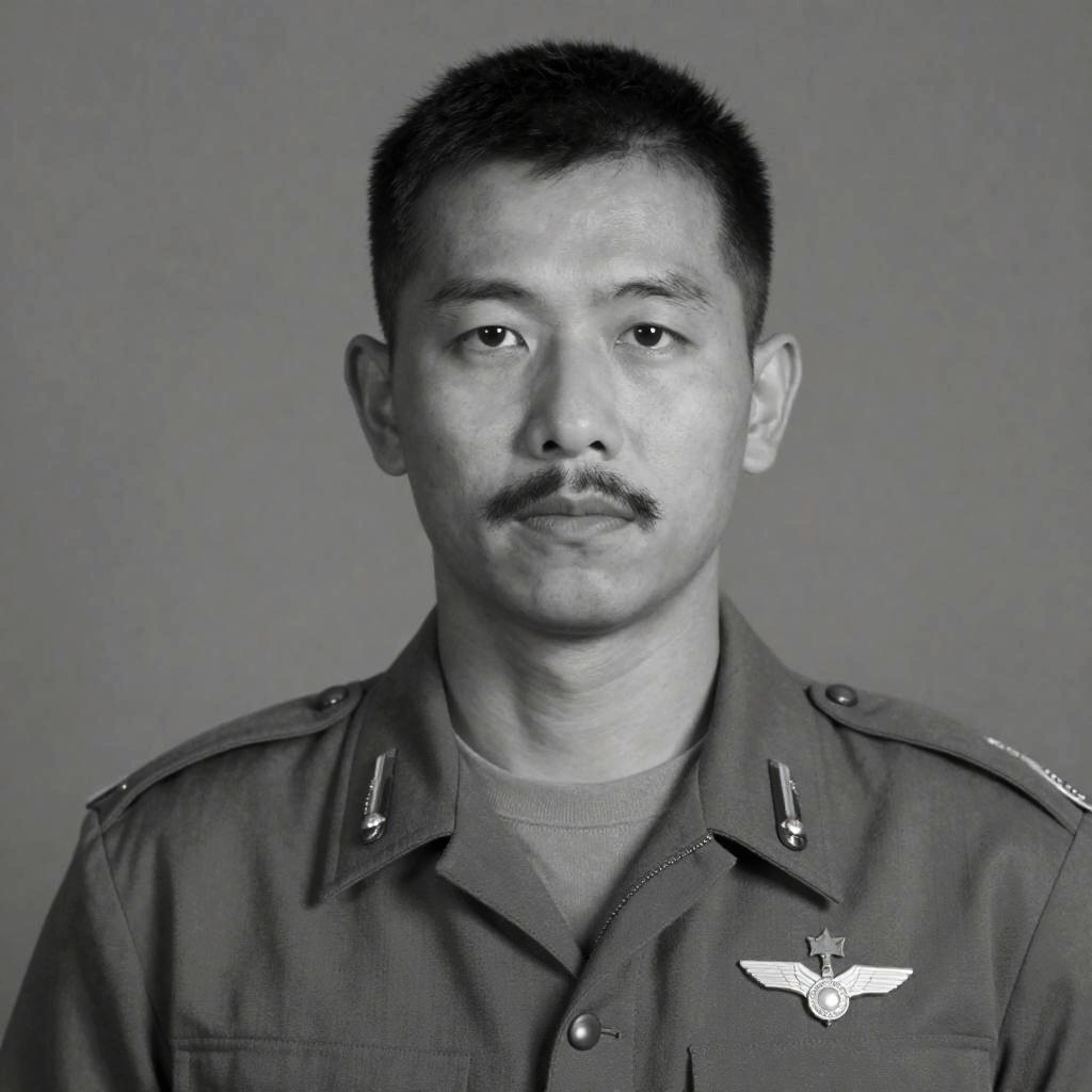 Photograph of a male naval officer with dark skin and stern expression, wearing a white naval cap with a gold emblem, black naval uniform with gold buttons, and multiple colorful ribbons on the left chest. Black background.