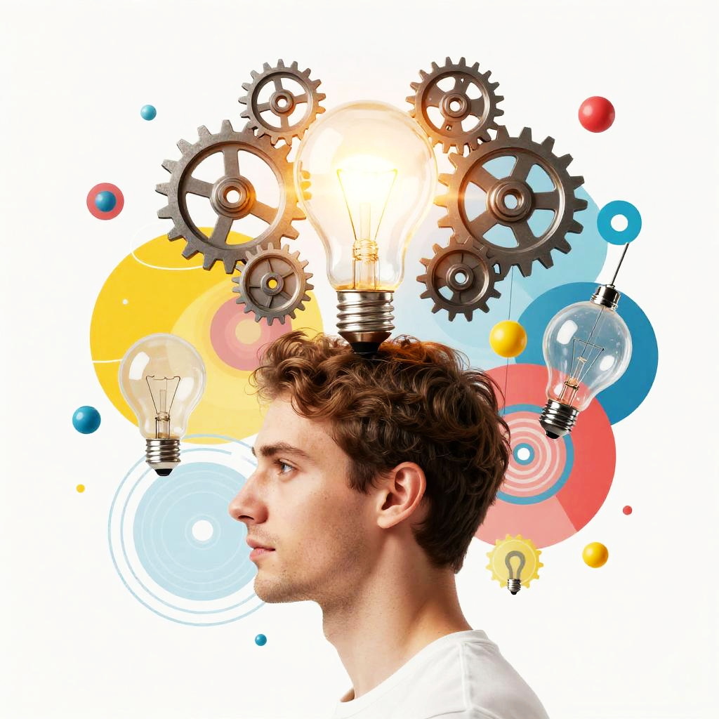 Inventation inspired artwork featuring a creative mind with a glowing light bulb made of gears above their head, abstract representation of ideas transforming into inventions, bright color palette with futuristic elements blending science and imagination.