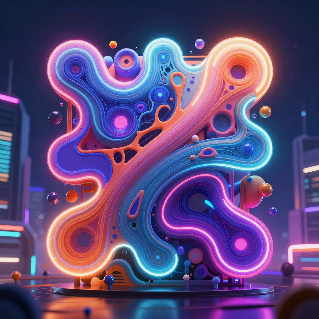 AI art picture showcasing a vibrant fusion of abstract digital shapes, neon colors and organic patterns, illuminated by glowing light effects, set against a futuristic cyberpunk cityscape, ultra-detailed and hyperrealistic style.