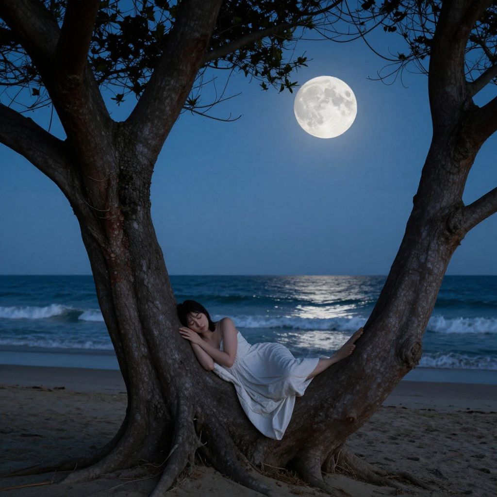 Photograph of a serene nighttime beach scene. A woman with fair skin and dark hair, wearing a white, semi-transparent dress, is curled up and sleeping in the crook of a large, dark tree with rough bark. The tree's branches frame a bright, full moon in a deep blue sky, casting a silver glow on the gently rippling ocean waves in the background. The sandy beach is visible beneath the tree, with subtle shadows adding depth to the scene. The overall mood is tranquil and dreamlike.
