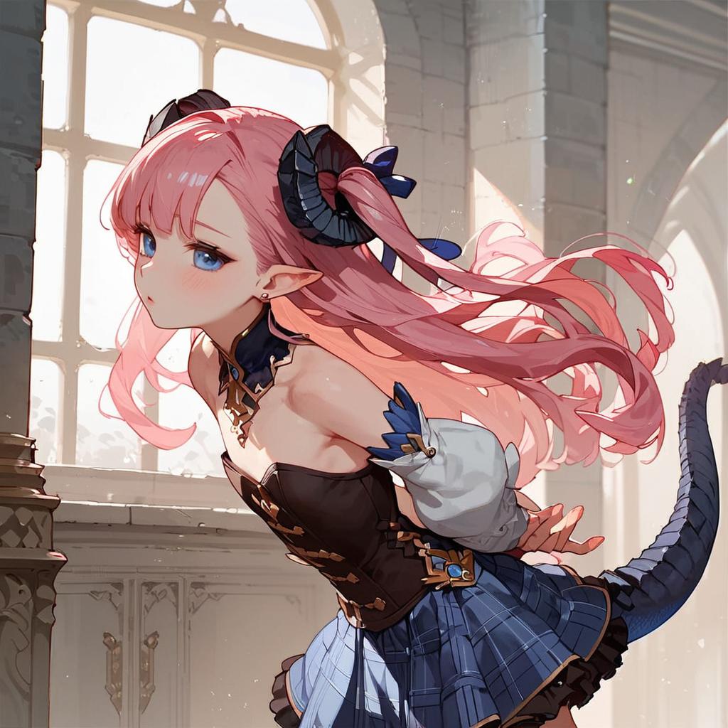 Score_9, score_8_up, score_7_up, score_6_up, score_5_up, score_4_up, best quality, high quality, source_anime, rating_safe, anime screencaplizsecond, pink hair, long hair, two side up, curled horns, pointy ears, blue eyes, dragon tail, hair ribbon, corset, plaid skirt, detached sleeves, bare shoulders, flat chest, 1girl, soloarms behind back, indoors, castle, stone walls, window