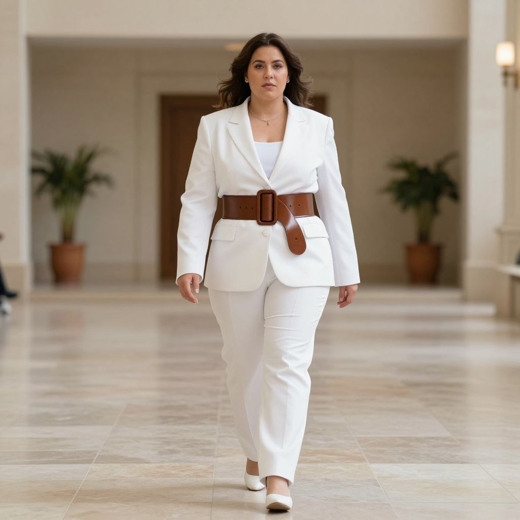 Large Size Woman Clothing Costume, woman in white suit and brown belt walking in a large hall