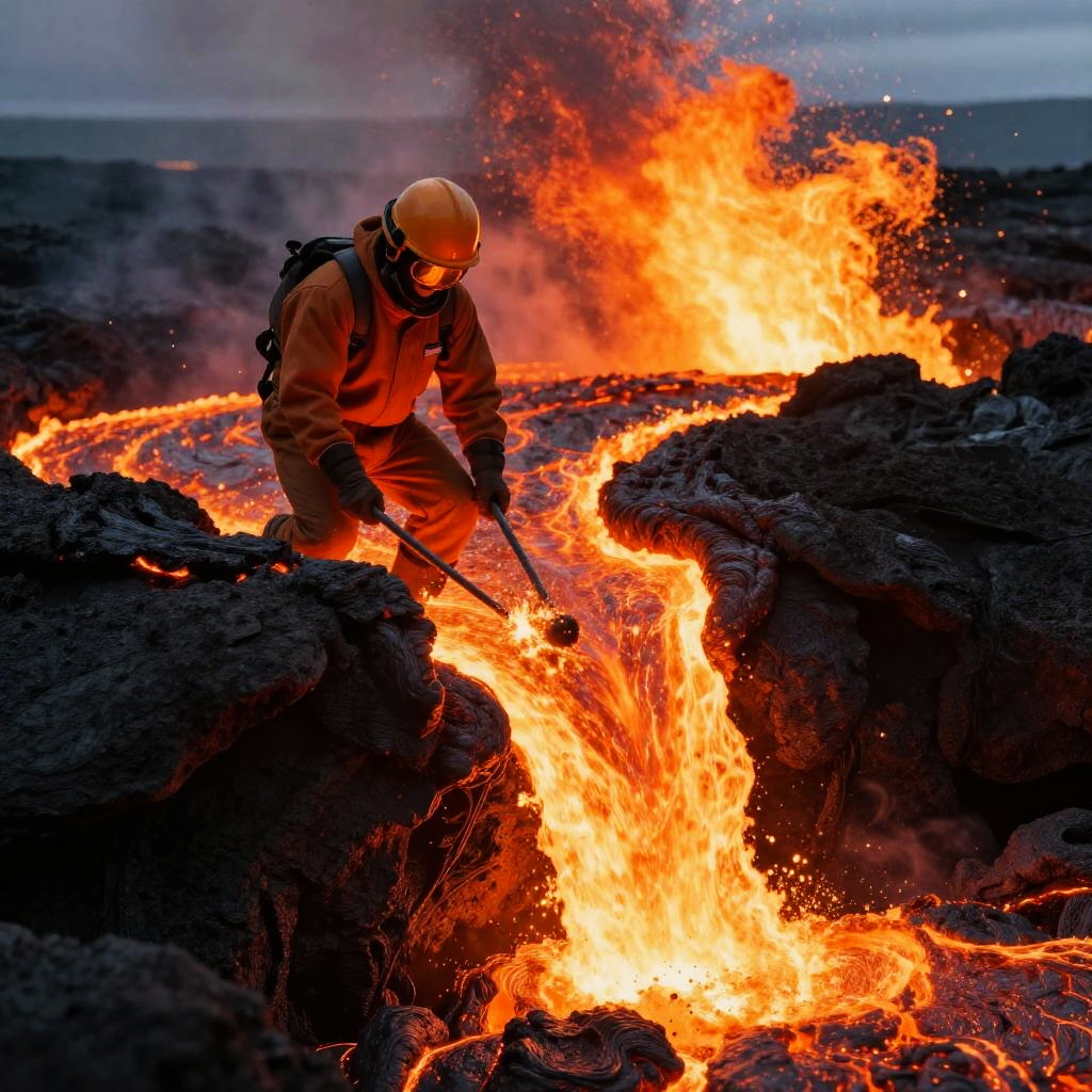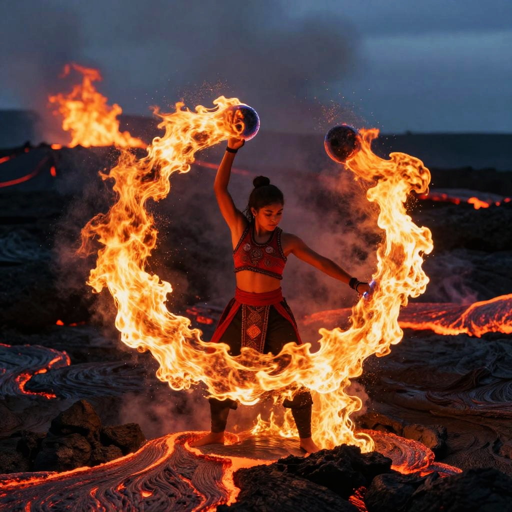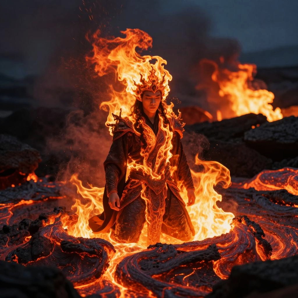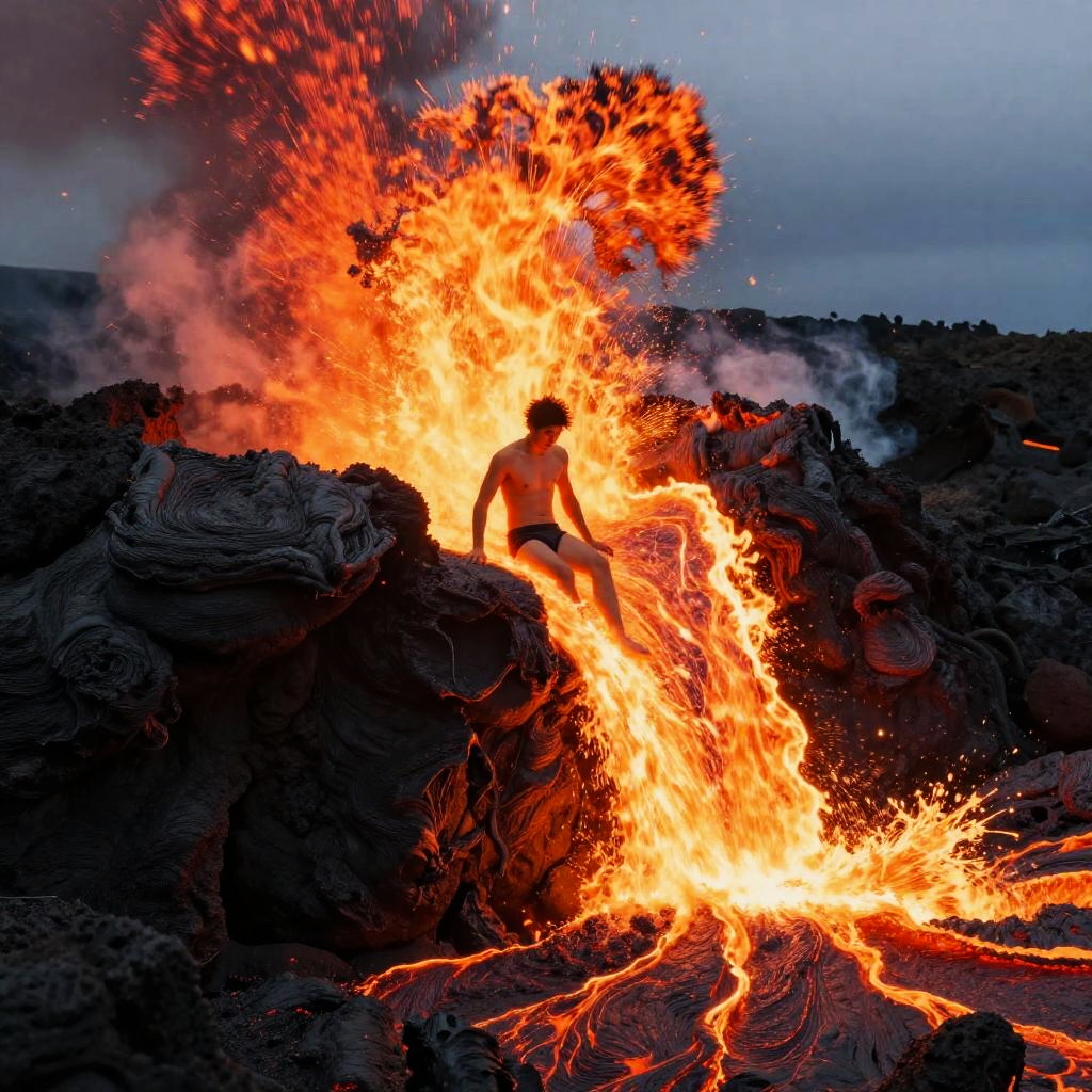 Mythical phoenix rising blending into flowing lava on a lava flow amidst magma eruptions. The scene captures a surreal fusion of human and natural elements, blending vibrant colors of lava and intense lighting for a dramatic, otherworldly effect.