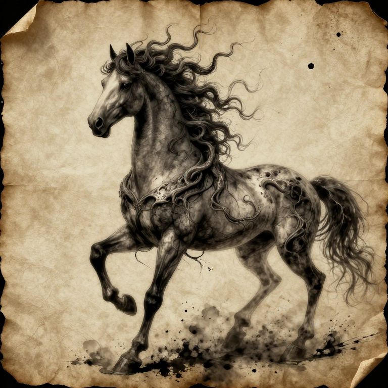 Ethereal roots entwine a spectral horse, its mane ablaze with gnarled tendrils, as dark splatters dance around its form on aged parchment, evoking a primordial storm of ink and myth.