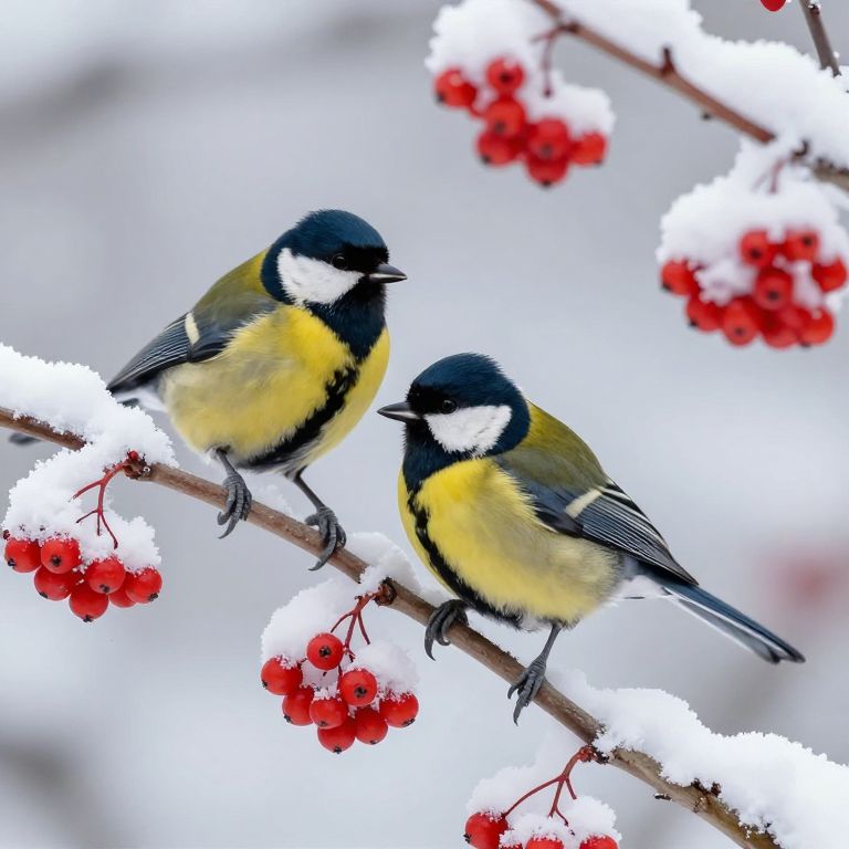 The image depicts a pair of great tits perched on a snowy branch laden with bright red berries, The birds, with their striking black caps, yellow bodies, and white wing bars, stand out against the wintery backdrop, The artist has captured the delicate details of the snow-covered berries and the birds' fluffy feathers, creating a sense of tranquility and beauty in the midst of the cold season