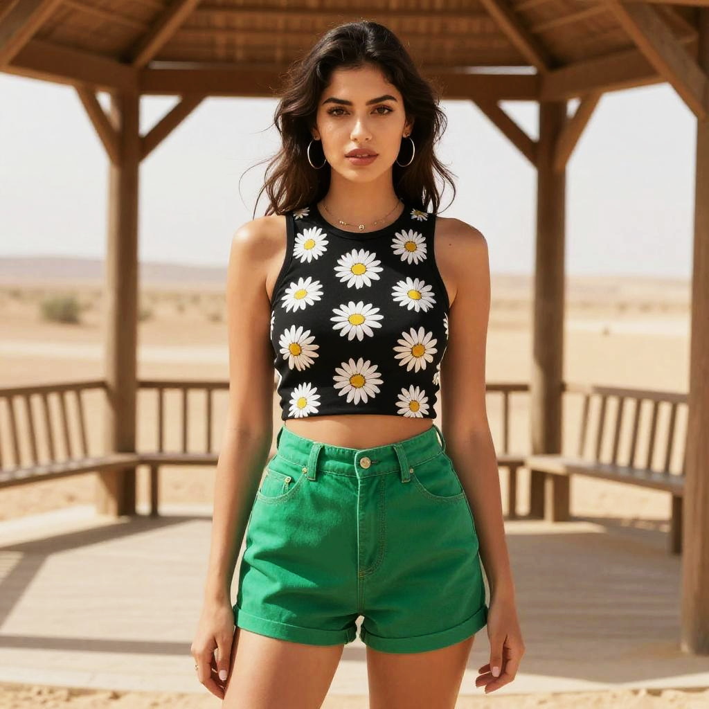 A vintage-styled athletic woman in black high-waisted shorts with suspenders and a floral white T-shirt stands in a tropical garden with a herb garden, surrounded by lush greenery and vibrant flowers. Sexy. Pretty face and beutiful eyes