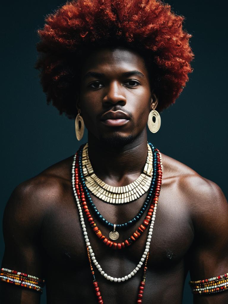African wear costume, jewelry, solo, afro, dark skin, necklace, bracelet, 1boy, earrings, male focus, colored skin, red hair, dark-skinned male